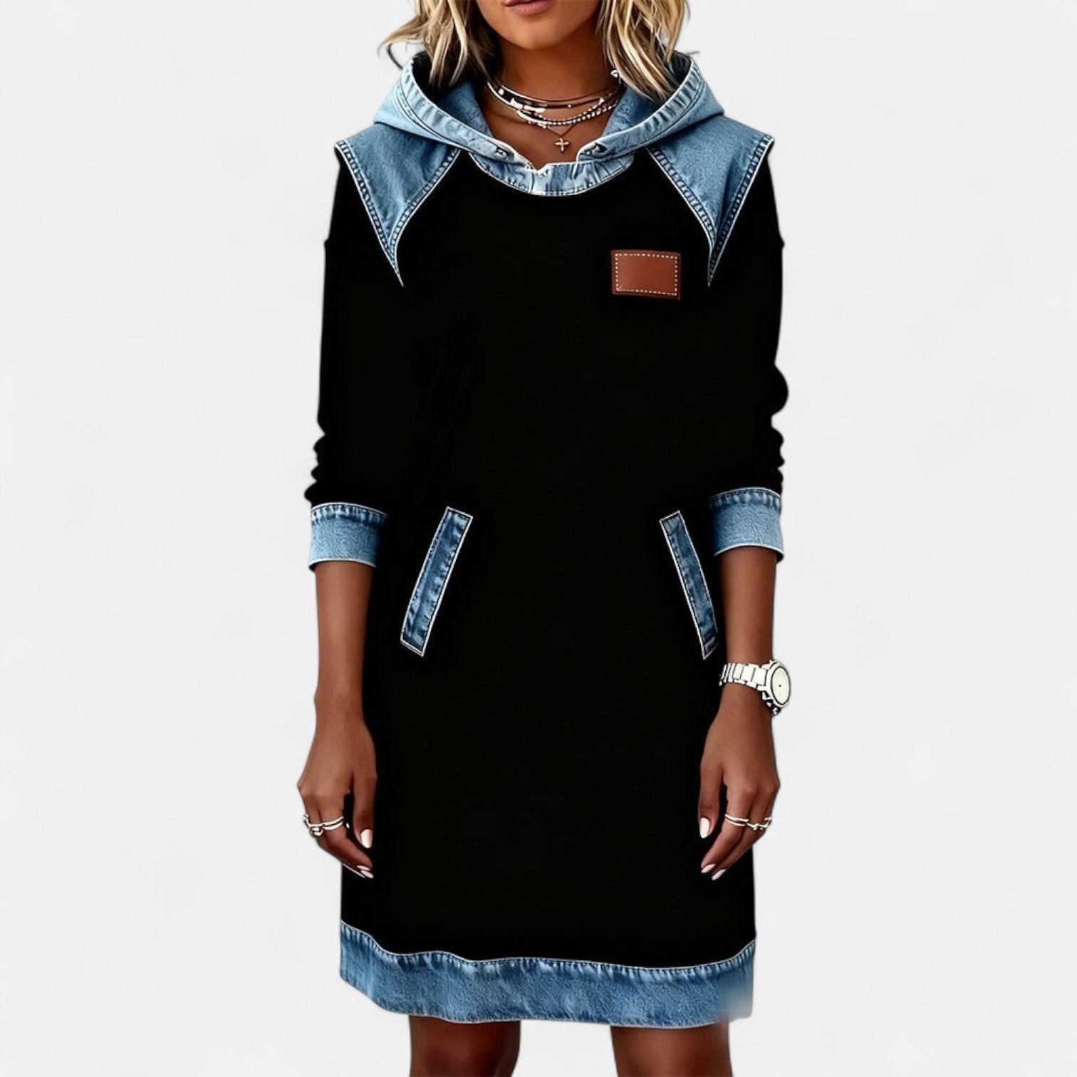 The Mila Hoodie Dress combines the best of both worlds: the comfort of your favorite sweater and the stylish look of a modern dress. The soft fabric embraces your body with warmth, while the denim details add a touch of character and originality.